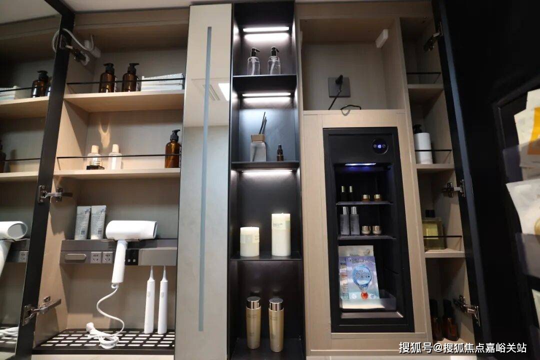 整面墙的镜柜,内部配备了美妆冰箱+门板收纳架+轨道式置物架,储物空间打造的非常充足。